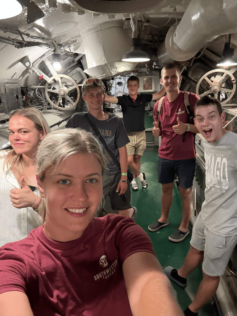 Kā aktivitāti izvēlējāmies doties uz Alabamu, lai apskatītu USS Alabama Battleship muzeju. Tas bija iespaidīgi – pats kuģis ir milzīgs, un tur varēja izstaigāt gan šaurās kajītes, gan redzēt, kā izskatās īsta karavīru dzīve uz kuģa. Uzzinājām arī dažādus interesantus faktus – piemēram, ka šis kuģis Otrā pasaules kara laikā saņēma iesauku “Mighty A”, jo tas izturēja vairākas lielas kaujas praktiski nesalaužams. ⚓️