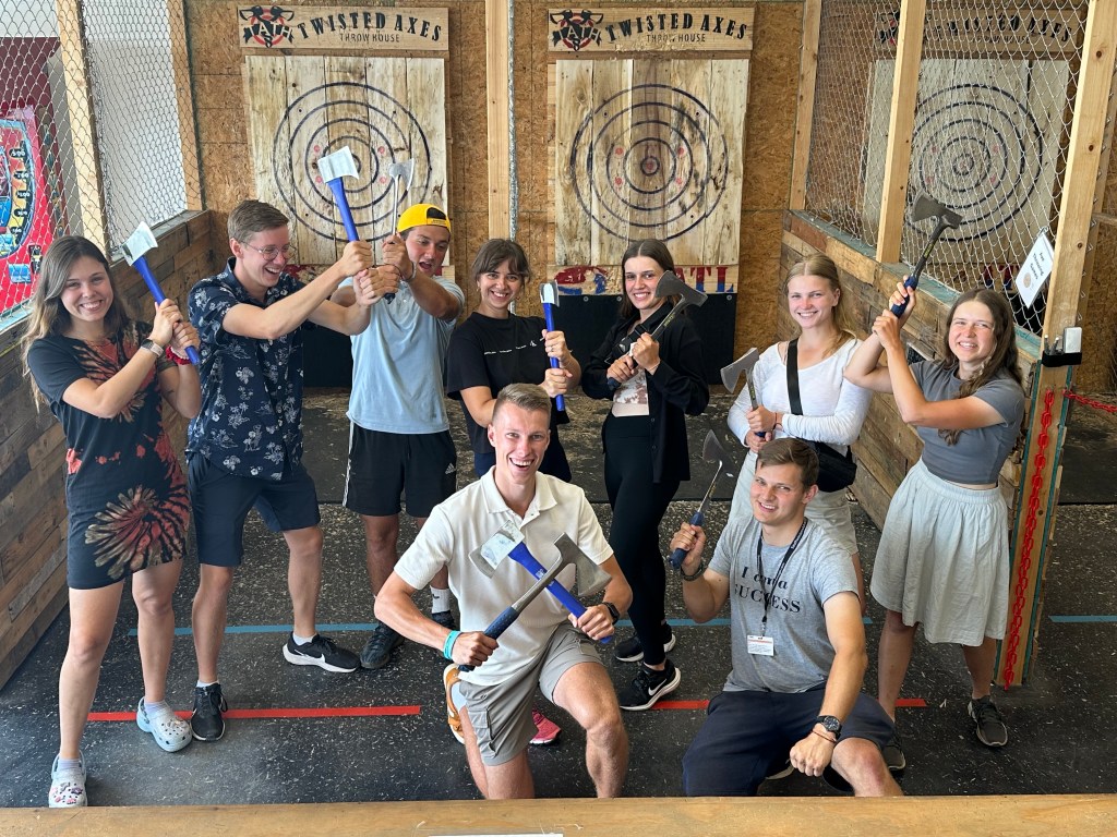 Jā, jūs pareizi sapratāt – cirvju mešana! Tā bija lieliska, adrenalīna pilna aktivitāte, kur pārbaudījām savu precizitāti, fokusēšanos un… arī cik eleganti protam mest cirvi. 😄